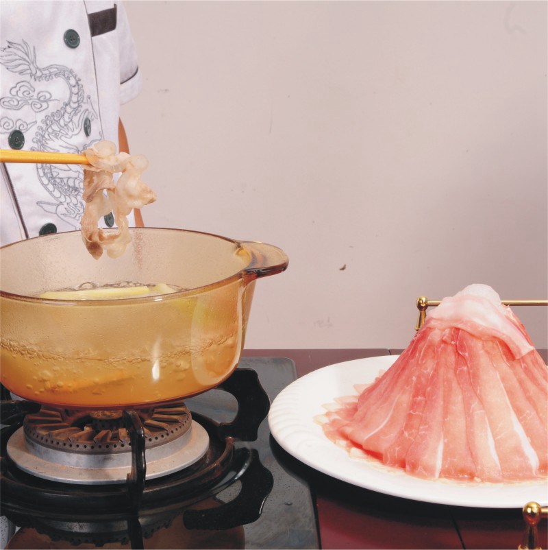 B.中火煮礦泉水(山泉水為最佳,不能使用自來水,因自來水中含氯制劑高影響口感),加以姜汁酒,小蔥段,煮開,下肉片,灼至肉片卷曲,即可撈出,灼好金針菇,灼好有機(jī)蔬菜圍邊。配以香辣蒜蓉碟,小蔥醬油碟、白切姜蔥碟,供蘸食
